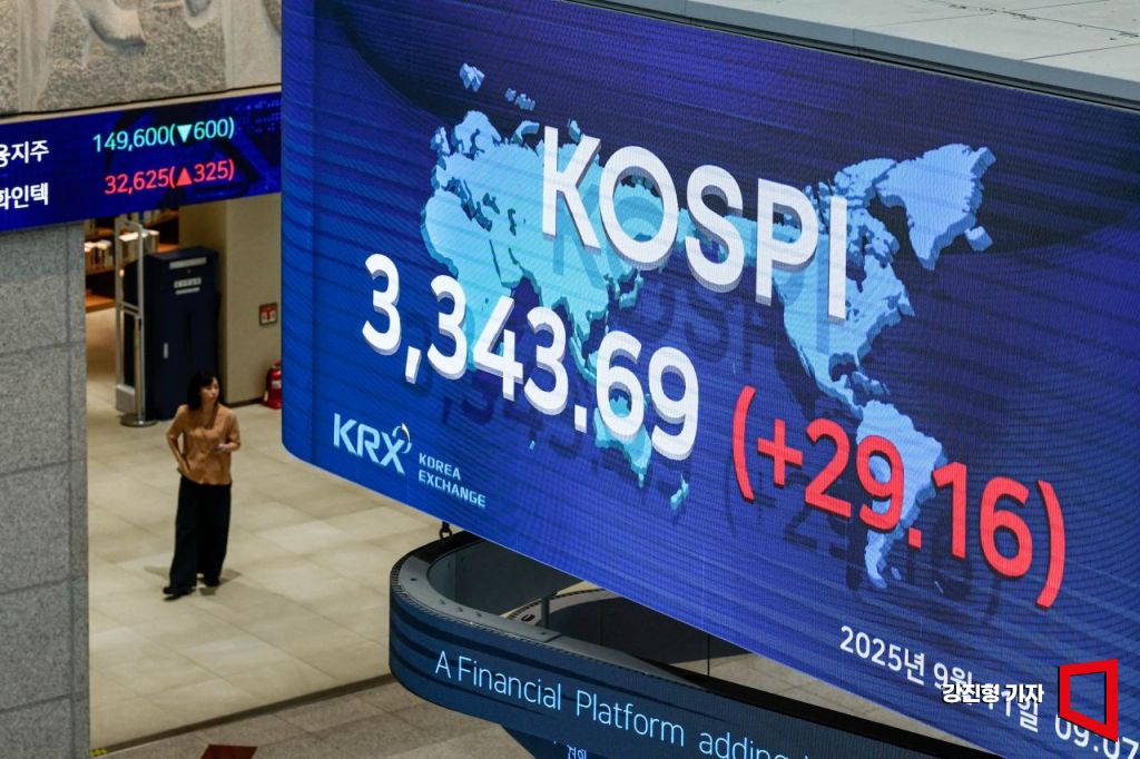 코스피 지수가 전 거래일 보다 22.07포인트 오른 3336.60으로 장을 시작하며 이틀 연속 사상최고치를 경신한 11일 서울 여의도 한국거래소 전광판에 코스피 지수가 표시돼 있다.