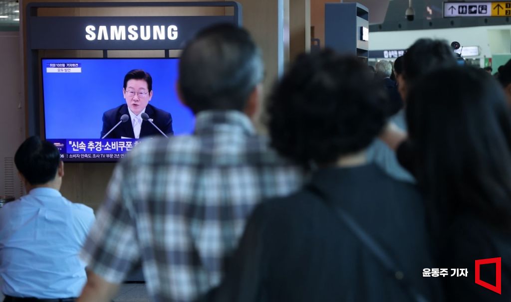 11일 서울역 대합실에서 시민들이 이재명 대통령의 취임 100일 기자회견 생중계를 지켜보고 있다.
