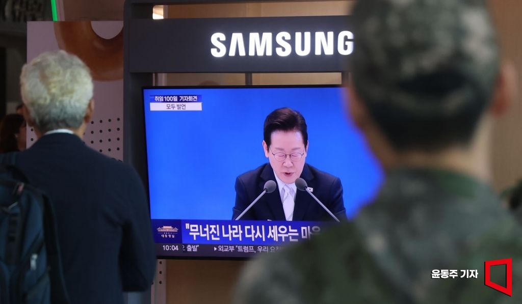 11일 서울역 대합실에서 시민들이 이재명 대통령의 취임 100일 기자회견 생중계를 지켜보고 있다.