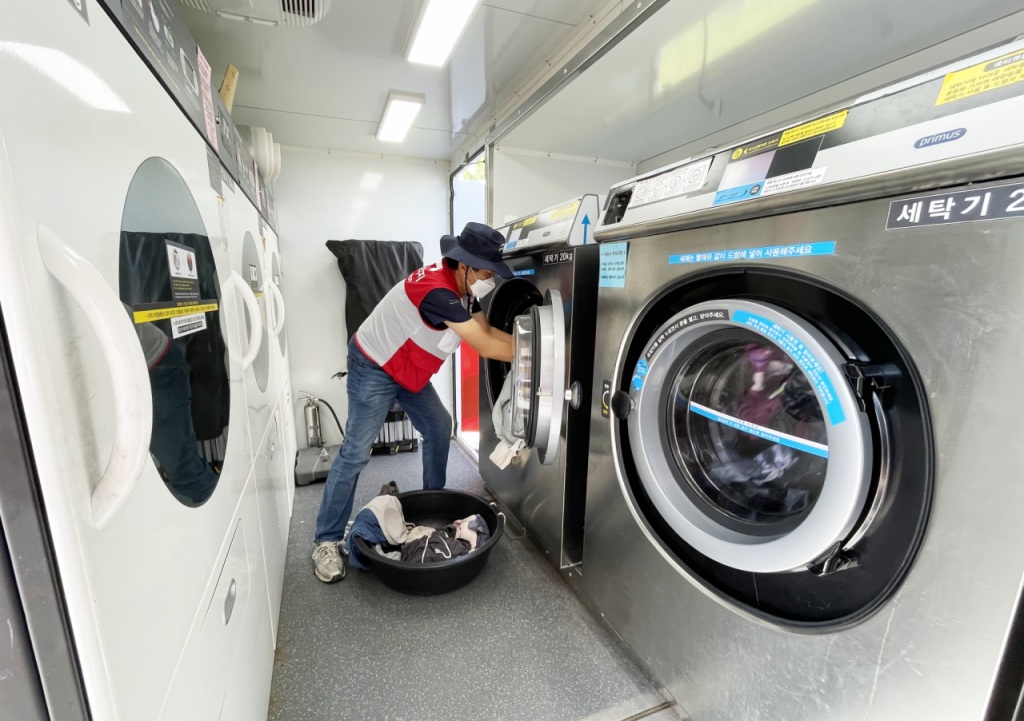 이번 세탁구호 현장에는 롯데그룹의 후원으로 제작된 5.5t 규모의 특수 이동형 세탁차량이 투입됐다. 차량에는 18㎏대형 세탁기 3대와 23㎏ 대형 건조기 3대가 탑재돼 있으며, 하루 8시간 기준 약 1000㎏의 의류와 이불 등을 현장에서 직접 세탁·건조할 수 있다.