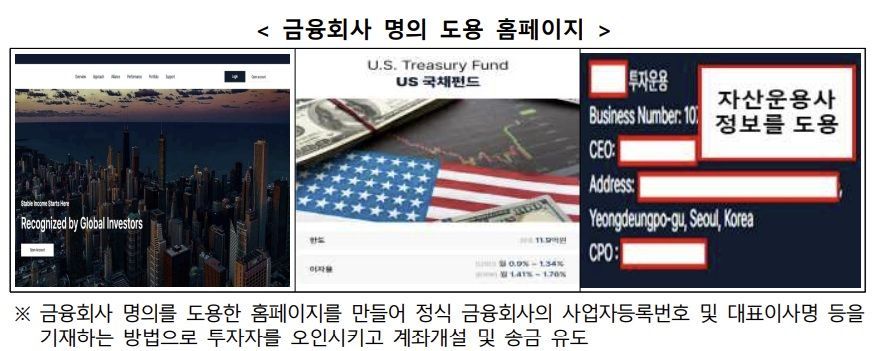 이들은 해당 금융회사(자산운용사) 명의를 도용한 가짜 홈페이지를 개설해 고수익을 미끼로 투자금 입금을 유도했다. 유튜브와 블로그에는 '미국 국채펀드 투자방법'을 소개하는 영상과 글을 대량 게재해 투자자들을 사칭 사이트로 끌어들였다. 실제로 한 투자자는 '월 1% 수익 보장'이라는 광고를 믿고 3000만원을 송금했다가 첫 달 소액 이자만 받은 뒤 환매가 이뤄지지 않고 업체가 잠적하는 피해를 입었다.