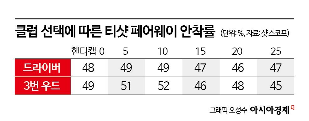 그러나 결과는 큰 차이가 없다. 샷 스코프의 데이터에 따르면 우드와 드라이버의 페어웨이 안착률 차이는 크지 않다. 비율로 따라지면 1~2% 정도다. 이는 무시할 수 있는 수준이다. 모든 핸디캡에 대한 평균을 보면 우드를 잡는 큰 이점이 없다. 오히려 드라이버를 잡고 좀 더 멀리 보낸 뒤 짧은 클럽으로 그린을 공략하는 것이 낫다는 조언이다.