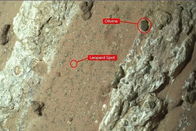 나사의 로봇탐사차 퍼시비런스가 지난해 7월 촬영한 화성의 체야바폭포 암석. 연구진은 이 암석에서 먼 옛날 미생물이 남긴 흔적으로 볼 수 있는 표범 반점(왼쪽 빨간색 원)을 발견했다. 오른쪽 빨간색 원은 화산 활동으로 생성된 감람석이다. NASA