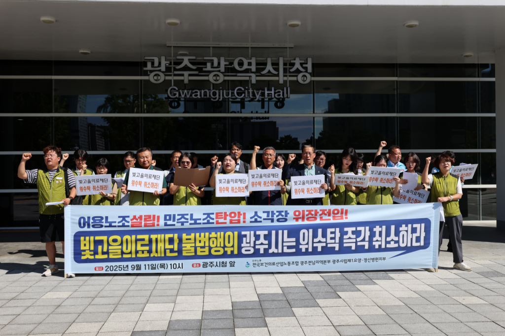 보건의료노조 광주전남지역본부 광주시립제1요양·정신병원지부는 11일 오전 광주시청 앞에서 기자회견을 열고 "어용노조 설립, 민주노조 탄압, 삼거동 쓰레기 소각장 후보지 선정 과정에서 주민 동의율을 높이기 위한 위장전입 등 빛고을의료재단의 불법행위를 규탄한다"며 "광주시는 위·수탁 계약을 즉각 취소할 것을 촉구한다"고 밝혔다.