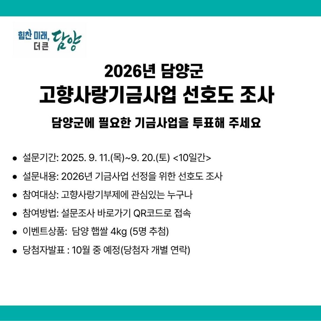 전남 담양군(군수 정철원)은 2026년 고향사랑기금 사업 선정에 기부자와 군민 의견을 반영하기 위해 오는 20일까지 10일간 '담양군 고향사랑기금사업 선호도조사'를 진행한다고 11일 밝혔다.