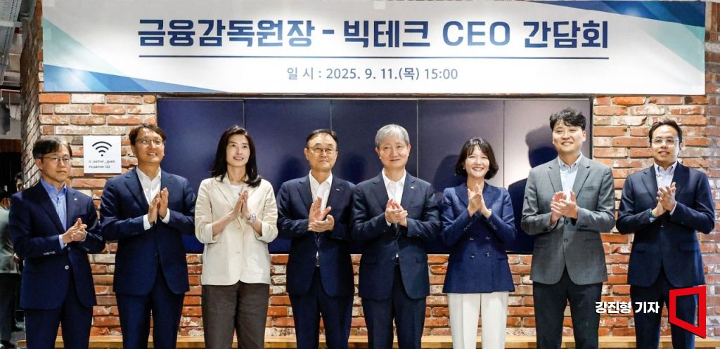 이찬진 금융감독원장(왼쪽 다섯 번째)을 비롯한 주요 참석자들이 11일 서울 강남구 네이버스퀘어 역삼에서 열린 '금융감독원장-빅테크 CEO 간담회'에서 기념사진촬영 하고 있다. 왼쪽부터 이종오 금융감독원 부원장보, 박대준 쿠팡 대표이사, 정신아 카카오 대표이사, 송치영 소상공인연합회 회장, 이찬진 금융감독원장, 최수연 네이버 대표이사, 이승건 토스 대표, 김범석 우아한형제들 대표이사.