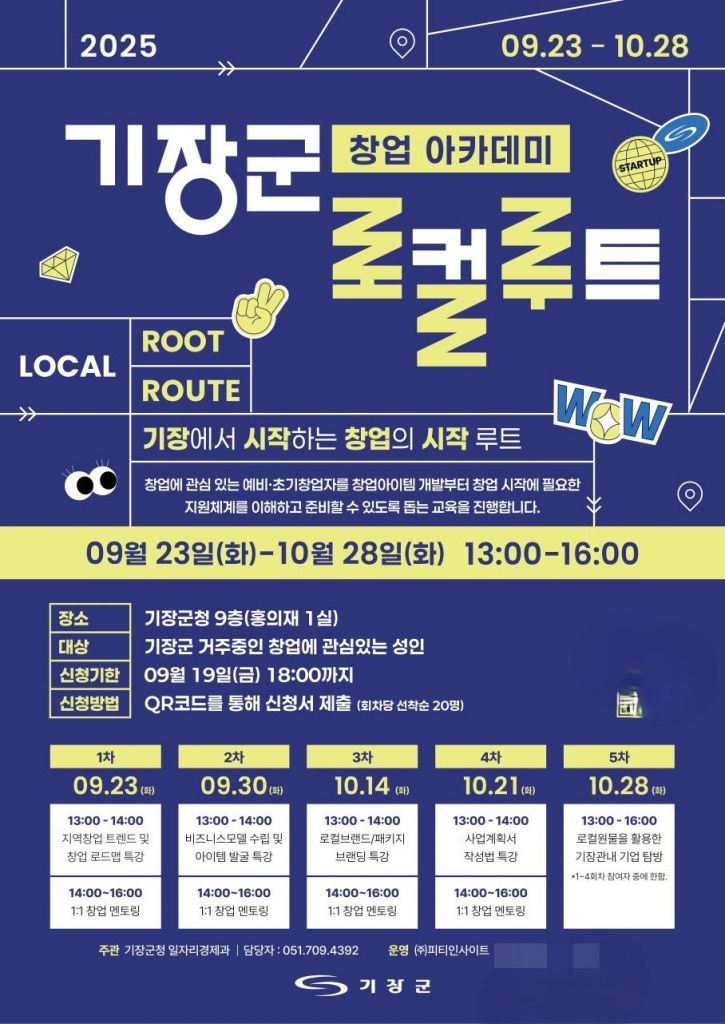 '창업 아카데미'는 9월 23일부터 10월 28일까지 기장군청 9층 홍의재 강의실에서 총 5회 과정으로 운영된다. 회차별 모집 인원은 20명 이내며, 기장군에 거주하는 19세 이상 예비 창업자와 창업 3년 이내 초기 창업자는 누구나 신청할 수 있다.