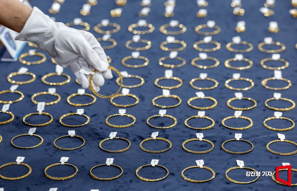 12일 인천공항세관 수출입통관청사에서 인천공항세관 직원이 금제품 등 국산으로 가장한 우회수출품을 공개하고 있다. 인천공항세관은 미국이 중국, 베트남, 인도네시아산 금 가공제품에 부과하는 고관세율을 회피하기 위해 금 가공제품(2839억원) 원산지증명서를 한국산으로 허위 조작하여 미국에 우회수출한 7개 업체를 적발했다.