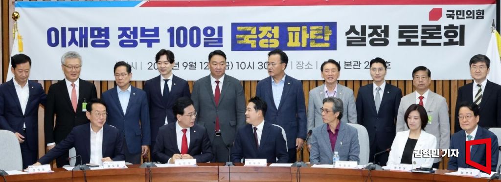 장동혁 국민의힘 대표와 송언석 원내대표가 12일 국회에서 열린 이재명 정부 100일 국정 파탄 실정 토론회에서 참석자들과 기념촬영을 하고 있다.