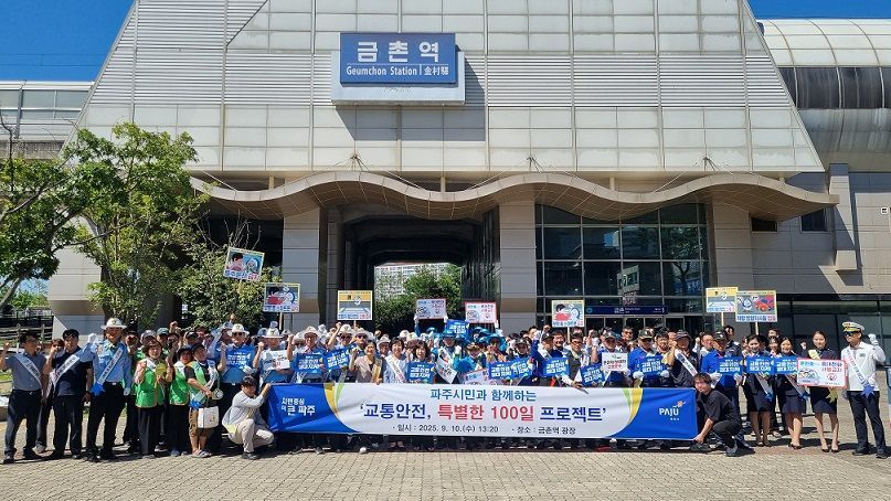 파주시는 지난 10일 '100일 프로젝트' 일환으로 경의중앙선 금촌역에서 파주시, 파주경찰서, 한국교통안전공단, 모범운전자회, 새마을교통봉사대 등 민간단체 및 운수사 100여 명이 함께 참여하는 '교통안전 캠페인'을 성공적으로 개최했다.