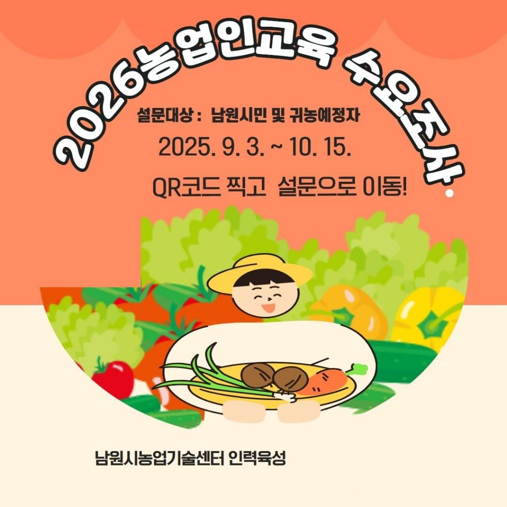 전북 남원시농업기술센터가 2026년 농업인 교육프로그램을 개발·운영하기 위해 '농업인 교육을 위한 설문조사'를 실시한다.