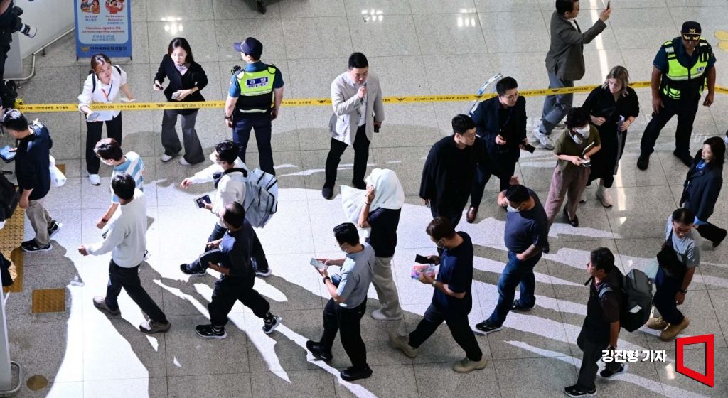 미국 이민 당국에 체포·구금됐다가 석방된 한국인 근로자들이 12일 오후 인천국제공항을 통해 귀국하고 있다. 풀려난 한국인들은 지난 4일 미국 조지아주 엘러벨의 현대차그룹-LG에너지솔루션 배터리 합작공장 건설 현장에서 체포·구금된 지 8일 만에 고국 땅을 밟게 됐다.