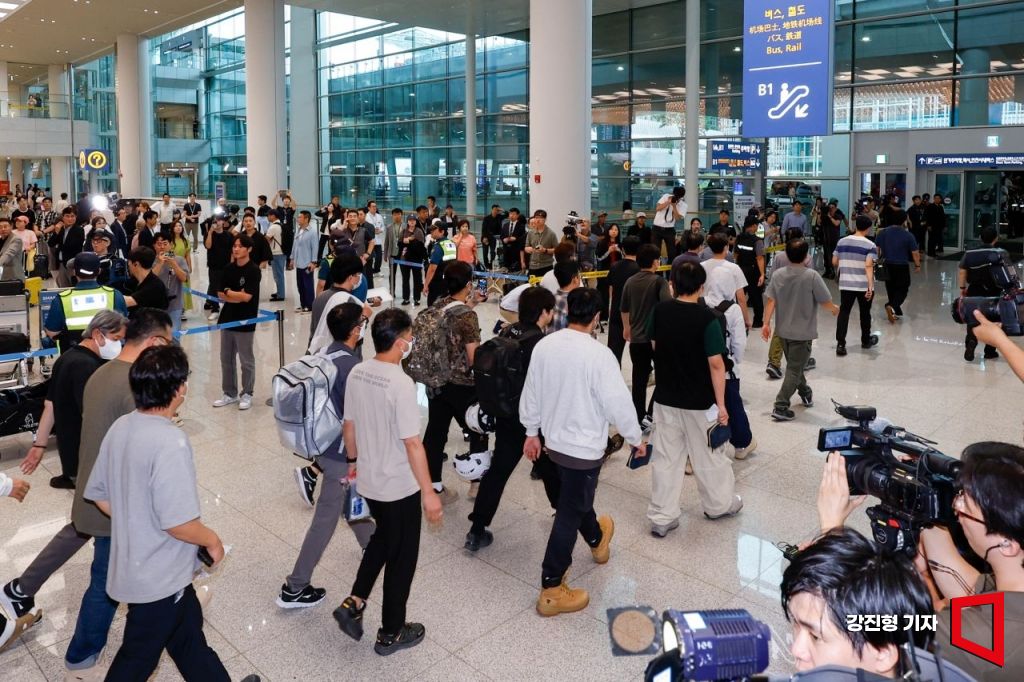 미국 이민 당국에 체포·구금됐다가 석방된 한국인 근로자들이 12일 인천국제공항 제2여객터미널을 통해 귀국하고 있다. 풀려난 한국인들은 지난 4일 미국 조지아주 엘러벨의 현대차그룹-LG에너지솔루션 배터리 합작공장 건설 현장에서 체포·구금된 지 8일 만에 고국 땅을 밟게 됐다.