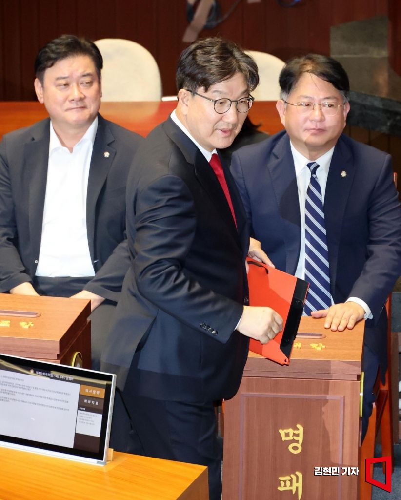 불법 정치자금 수수 혐의를 받는 국민의힘 권성동 의원이 11일 국회 본회의에서 자신의 체포동의안 투표를 하고 있다. 2025.9.11 김현민 기자