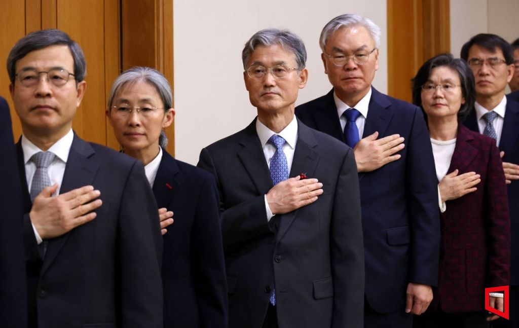 조희대 대법원장이 15일 서울 서초구 대법원 대회의실에서 열린 전국법원장회의에서 대법관들과 국민의례를 하고 있다. 사진=사진공동취재단