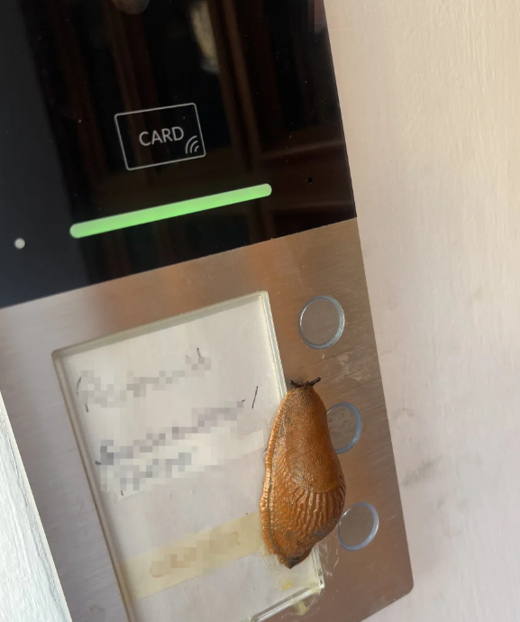 독일의 한 아파트 현관 초인종 기기에 붙어있는 민달팽이. 독일 빌트