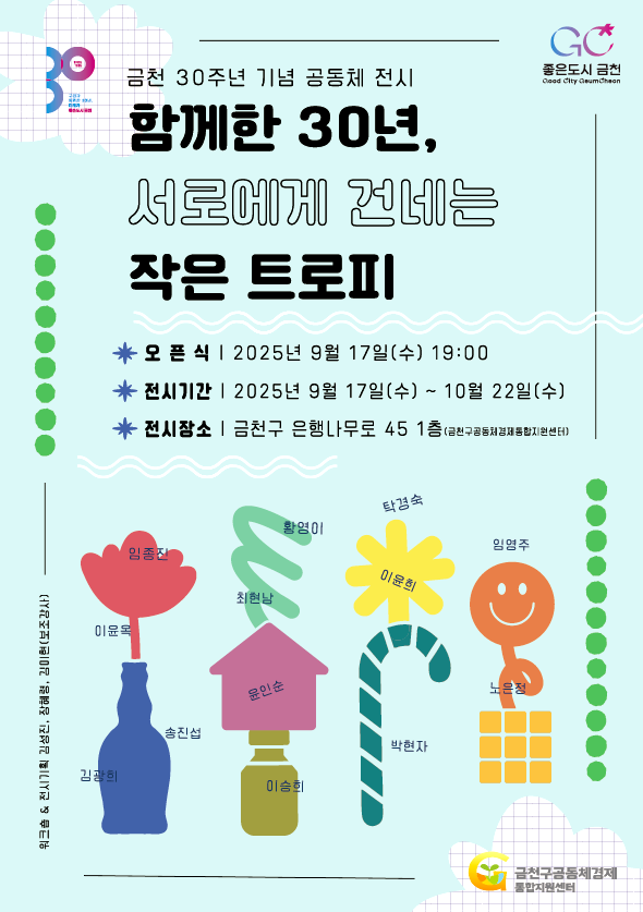 서울 금천구(구청장 유성훈)는 개청 30주년을 맞아 오는 17일부터 금천구공동체경제통합지원센터에서 특별 기념전시 '함께한 30년, 서로에게 건네는 작은 트로피'를 연다.