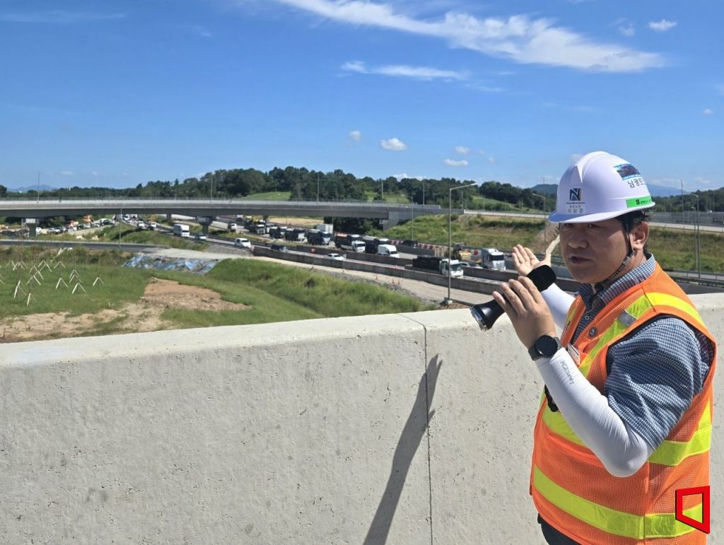 이상준 남광토건 현장소장이 지난 11일 전북 완주군 이서면 새만금~전주 고속도로 이서 분기점 공사현장에서 사업 진행 상황을 설명하고 있다. 아래로 호남고속도로가 보인다. 최서윤 기자