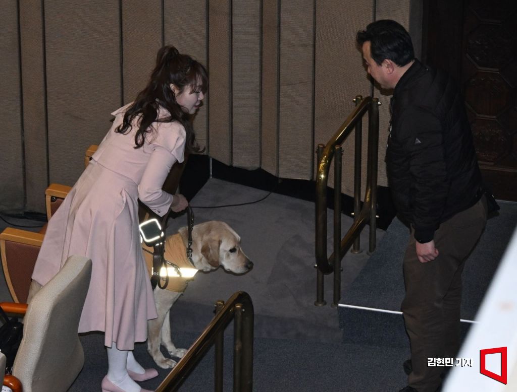 김예지 국민의힘 의원과 새 안내견 태백이가 27일 국회 본회의장을 나서고 있다. 2025.2.27 김현민 기자