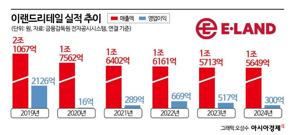 반면 유통 부문을 담당하는 이랜드리테일은 지난해 매출 1조5649억원, 영업이익 300억원으로 전년 대비 0.4%, 41.9% 감소했다. 지난해 말 기업신용등급은 'BBB+ 부정적'에서 'BBB 안정적'으로 하향 조정되기도 했다. 한국기업평가는 "이익창출력 부진, 투자 부담, 계열사 지원 등으로 높은 재무 부담이 지속된다"고 설명했다.