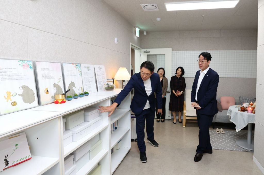 화성시가 '자살대책 TF팀'을 꾸려 지역 맞춤형 사업을 강화한다. 정명근 화성시장(오른쪽)이 최근 동탄호수공원 주차타워에 새 둥지를 마련한 '화성시자살예방센터'를 15일 방문해 시설 운영상황을 둘러보고 있다. 화성시 제공