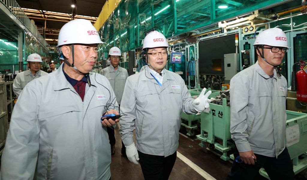 15일 '자동차 산업 수출 공급망 강화를 위한 금융지원' 1호 지원 기업인 (주)서진산업 시흥 본사를 방문한 이호성 하나은행장(사진 앞줄 왼쪽에서 두번째)이 최재홍 서진산업 대표이사(사진 앞줄 왼쪽에서 첫번째)로 부터 생산시설에 대한 설명을 듣고 있다. 하나은행