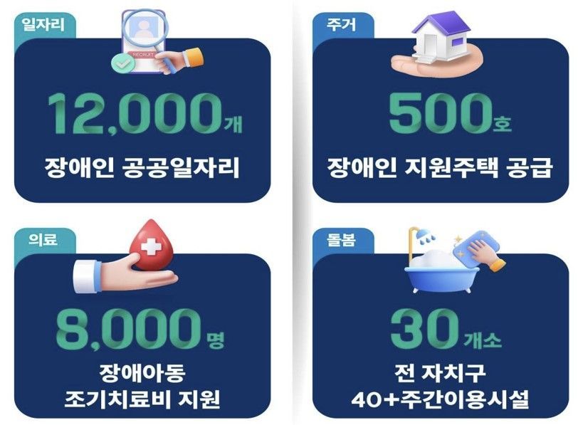 이외에도 저소득 중증장애인 생활 안정을 위한 '서울형 장애인 부가급여'를 현재 월 4만원에서 2030년까지 월 8만원으로 2배 인상해 3만여명에게 지급할 방침이다. 최중증 장애인 자녀를 돌보는 65세 이상 고령가족에게는 월 30만원을 신규로 지급하기로 했다.