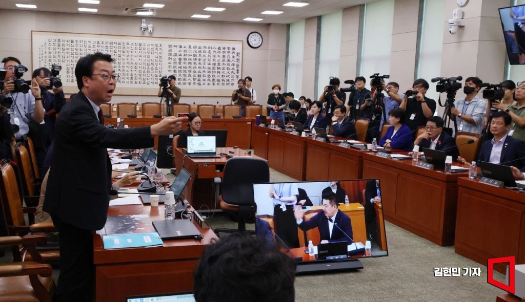 곽규택 국민의힘 의원이 16일 국회에서 열린 법제사법위원회 전체회의에서 최혁진 무소속 의원의 발언에 항의하고 있다.