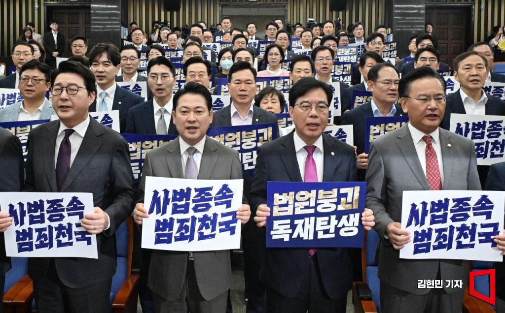 국민의힘은 이날 오전 긴급 의원총회를 열고 더불어민주당의 조 대법원장 사퇴 압박을 규탄했다. '사법 종속 범죄 천국', '법원붕괴 독재 탄생'이라는 피켓을 들고 "민주주의를 지켜내자"는 구호를 외쳤다.