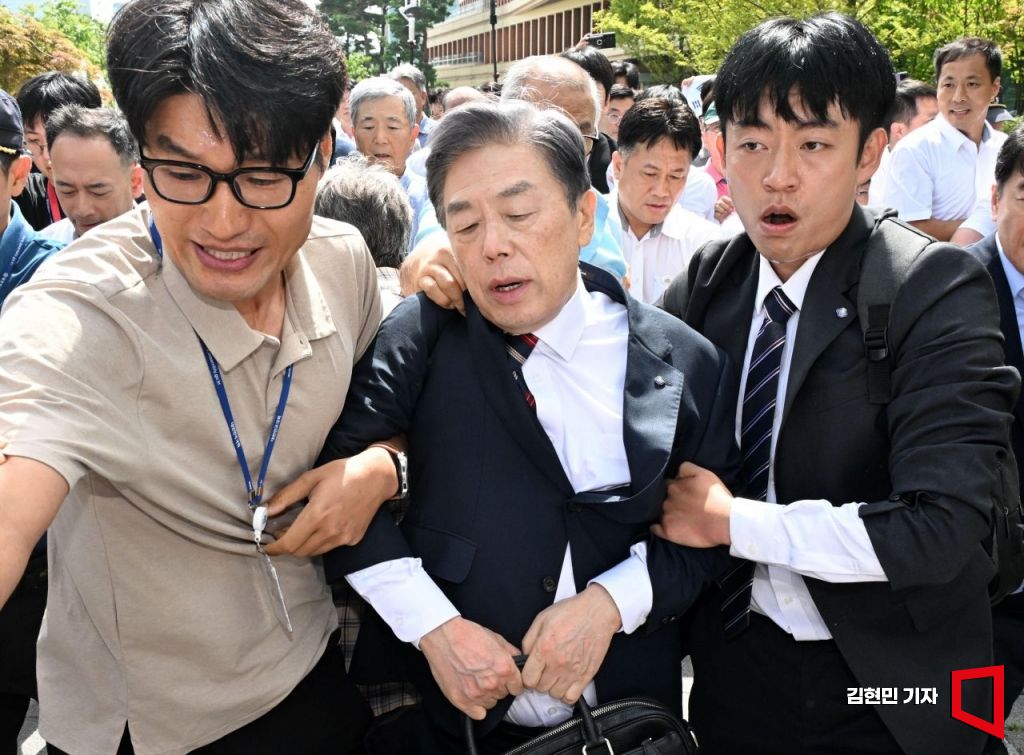 김형석 독립기념관장이 8일 국회 소통관에서 '독립기념관 바로 세우기' 기자회견을 마친 뒤 시민단체의 항의를 받으며 회견장을 떠나고 있다. 2025.9.8 김현민 기자