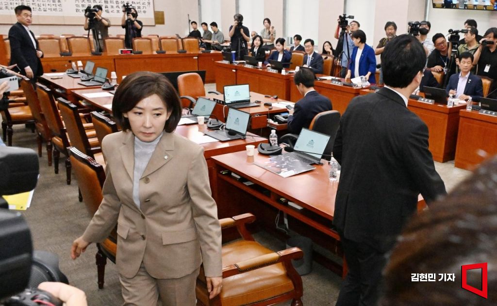 추미애 법사위원장이 16일 국회에서 열린 법제사법위원회 전체회의에서 국민의힘 나경원 의원 간사 선임의 건 표결에 대해 무기명 투표를 선언하자 국민의힘 의원들이 이에 항의하며 퇴장하고 있다. 2025.9.16 김현민 기자