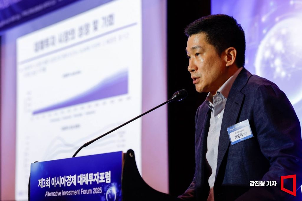 허윤혁 한국투자공사 사모주식투자실장이 16일 서울 여의도 콘래드호텔에서 열린 '제3회 아시아경제 대체투자포럼'에 참석해 ‘최신 글로벌 대체투자 트렌드’란 주제로 강연 하고 있다. 2025.9.16 강진형 기자