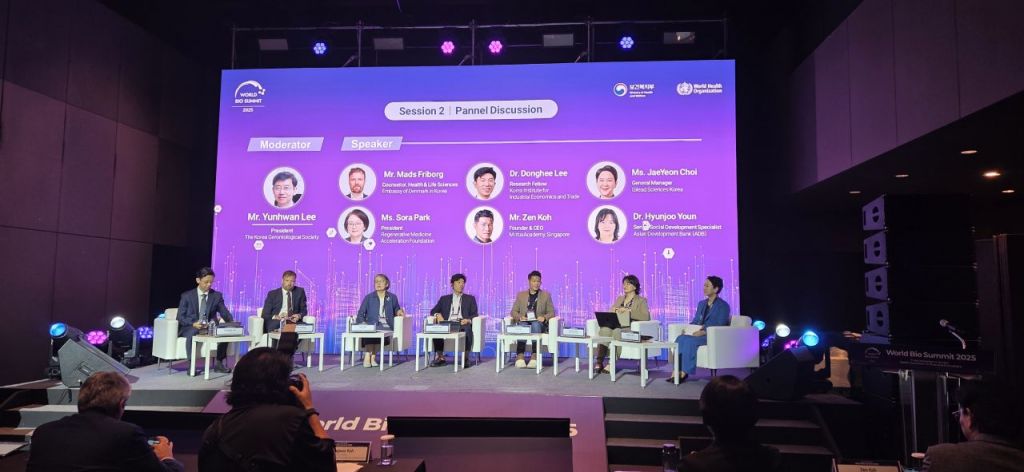 보건복지부와 세계보건기구(WHO)가 공동으로 17일 서울 중구 신라호텔에서 개최한 '세계 바이오서밋 2025' 두번째 세션 '고령화 & 의료기술'을 주제로 한 토론에서 패널들이 대화를 나누고 있다. 정동훈 기자