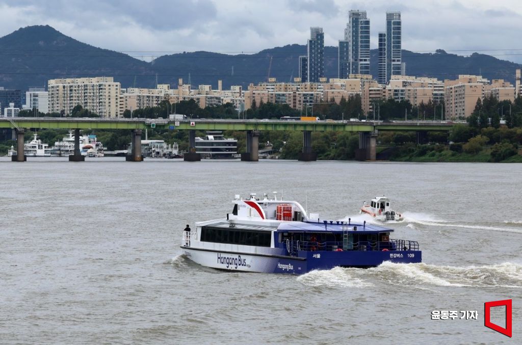 18일 본격적인 운항에 들어간 오세훈 서울시장과 취재진을 태운 한강버스가 서울 동작대교를 지나고 있다. 한강버스는 전날 폭우로 취소된 출항 시승 행사후 11시부터 본격적인 운항을 시작한다. 한강버스는 폭우, 결빙 등 기상상황에 따라 운행이 제한된다.