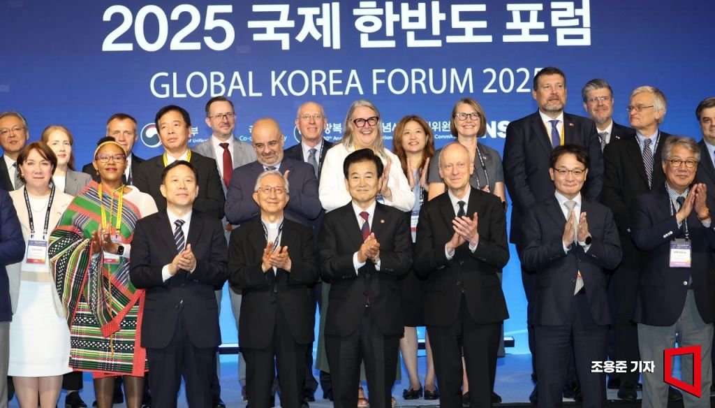 정동영 통일부 장관과 마이클 샌델 미 하버드대 교수 등 참석자들이 18일 서울 종로구 포시즌스호텔에서 열린 '2025 국제한반도포럼(GKF)' 개막식에서 기념촬영을 하고 있다.
