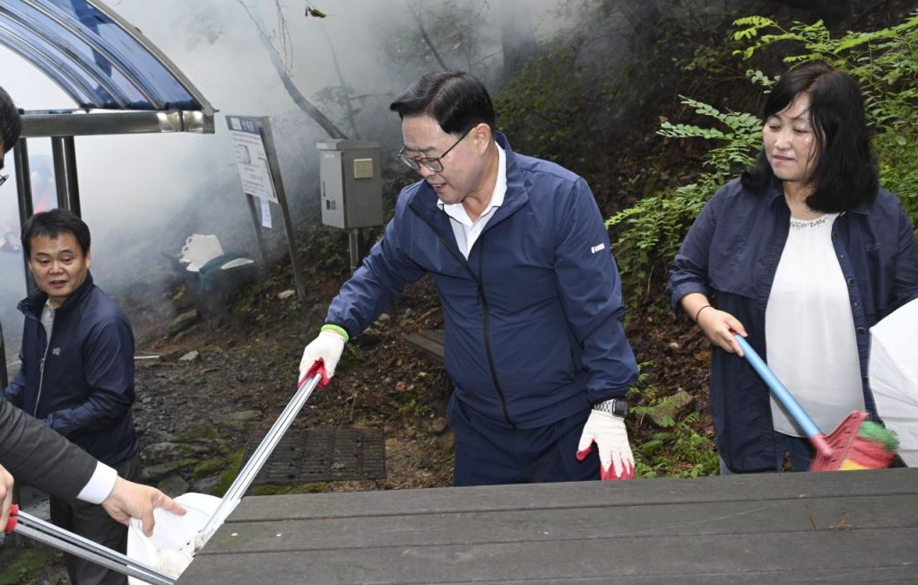 18일 회암사 약수터에서는 강수현 시장과 도시환경사업소장 등 관계자들이 참여해 낙엽과 쓰레기 등 오염원을 제거하고, 취수구 소독·방역 및 주변 시설 점검을 실시했다.