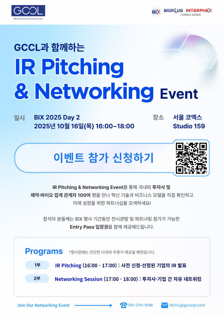 지씨씨엘은 행사 둘째 날인 다음달 16일 오후 4시, 코엑스 2층 스튜디오159에서 'GCCL과 함께하는 IR 피칭 & 네트워킹 이벤트'를 단독 주최한다. 이번 행사에는 국내외 제약·바이오 기업과 투자사 100여명이 참가해 혁신 기술과 비즈니스 모델을 직접 확인하고, 미래 성장을 위한 전략적 파트너십을 모색할 수 있다. 본 행사는 제약·바이오 기업들의 IR 발표와 자유로운 네트워킹으로 진행될 예정이며, 현재 해당 행사에 참가하고자 희망하는 참가자를 모집하고 있다.