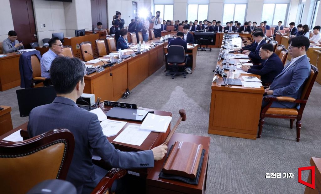 18일 국회에서 열린 행정안전위원회 법안심사제1소위원회에서 윤건영 소위원장이 의사봉을 두드리고 있다. 2025.9.18 김현민 기자