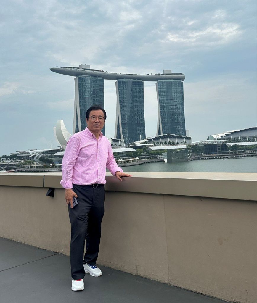 아현재 하남시장이 18일 싱가포르를 방문해 '마리나베이 샌즈 호텔'을 배경으로 기념촬영을 하고 있다. 하남시 제공
