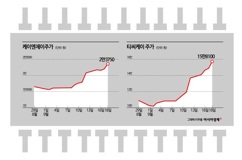 18일 금융투자업계에 따르면 이달 들어 티씨케이와 케이엔제이 주가는 각각 44.4%, 43.7% 상승했다.
