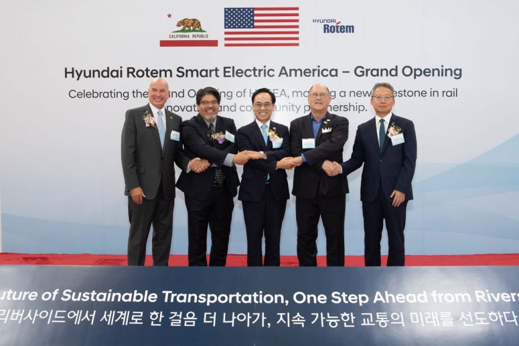 18일(현지시간) 미국 캘리포니아주 리버사이드시에서 진행된 '현대로템 스마트 일렉트릭 아메리카(HRSEA)'전장품 공장 준공식 기념사진. 왼쪽부터 로스앤젤레스(LA)메트로 철도차량 사업 총괄과 마이크 퓨트렐, 제스 몬테스 리버사이드시 행정시장, 이용배 현대로템 대표이사 사장, 척 콘더 리버사이드시 시의원, 김영완 주미 LA 총영사. 현대로템