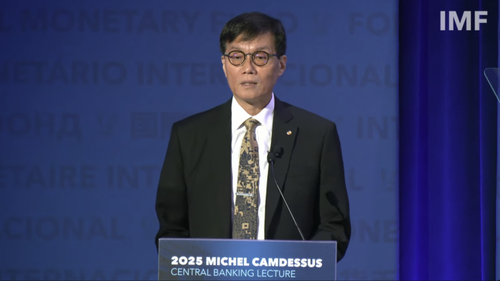 이창용 한국은행 총재가 18일(현지시간) 미국 워싱턴 DC 국제통화기금(IMF) 본부에서 열린 '미셸 캉드쉬 중앙은행 강연'에서 한국의 통화정책에 대해 설명하고 있다. IMF 유튜브 생중계 캡처