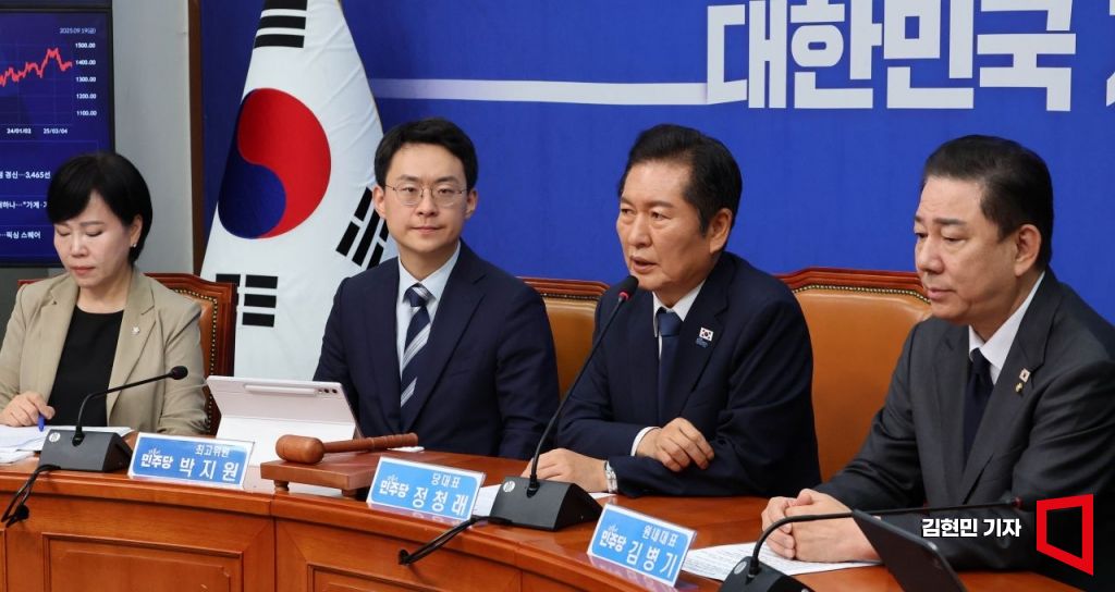 정청래 더불어민주당 대표가 19일 국회에서 열린 최고위원회의에서 발언하고 있다. 김현민 기자