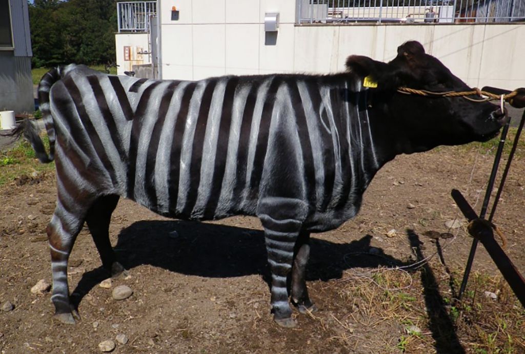 일본 연구진이 검은 소에 얼룩말과 바슷한 줄무늬를 그린 결과 모기, 쇠파리 등이 달라붙는 횟수가 절반으로 줄었다. PLOS ONE저널의 일본 연구진 연구 보고서