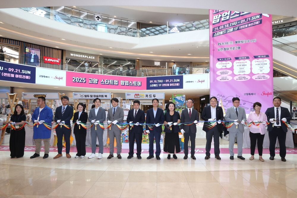 이동환 고양특례시장과 관계자들이 지난 18일 스타필드 고양과 협업해 열린 '2025 고양 스타트업 팝업스토어'에서 테이프 커팅을 하고 있다. 고양특례시 제공