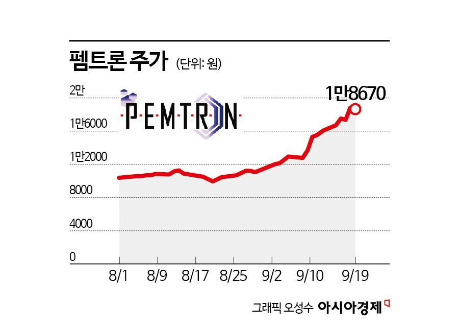 22일 금융투자업계에 따르면 지난달 말 1만1000원 선에 머물던 펨트론 주가는 이달 들어 1만8000원을 돌파했다. 19일 1만8650원으로 거래를 마치면서 상승률 69.1%를 기록했다. 외국인과 기관 투자자가 이달에만 각각 106억원, 28억원 순매수했다.