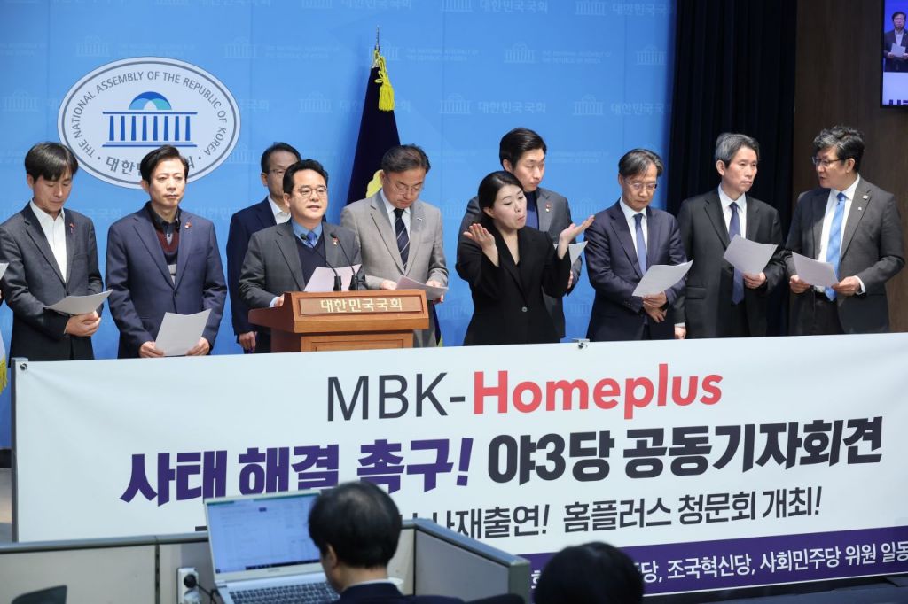 민 위원장은 "홈플러스 인수 당시 142개의 점포 수가 123개로 줄었고, 최근엔 20개 점포를 추가 폐점하겠다는 계획을 발표했다"며 "최근엔 MBK가 최대 주주로 있는 롯데카드에서도 해킹 사태가 발생했는데, 이쯤 되면 MBK가 과연 정상적인 기업을 운영하려고 하는 것인지 먹튀 자본의 행태를 답습하고 있는지 의구심이 든다"고 비난했다. 안수용 마트노조 홈플러스지부장은 홈플러스의 15개 점포 폐점 방침을 언급하며 민주당에 폐점을 막아달라고 요청했다.