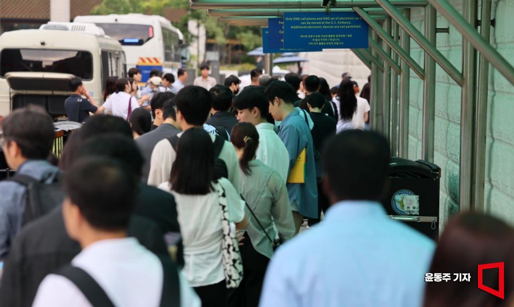 지난 8일 서울 종로구 주한 미국대사관에 시민들이 미국 비자를 발급 받기 위해 길게 줄을 서고 있다. 윤동주 기자