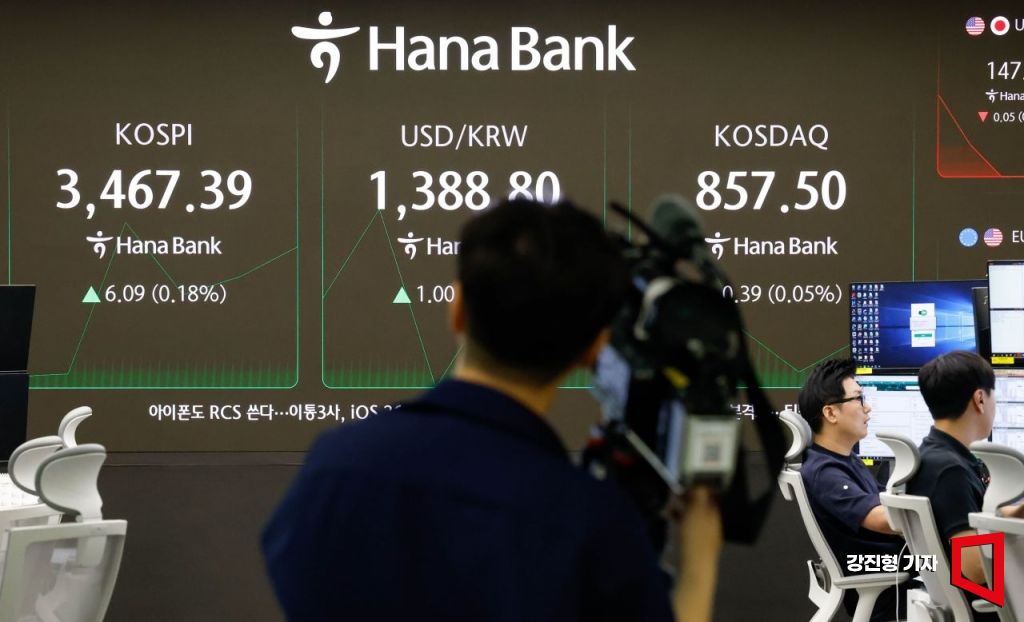 코스피 지수가 전 거래일 대비 0.07포인트 내린 3461.23에 개장한 19일 서울 중구 하나은행 본점 딜링룸에서 딜러들이 업무를 보고 있다. 이날 코스닥 지수는 전 거래일 대비 0.97포인트 오른 858.08에 거래를 시작했다. 2025.9.19 강진형 기자