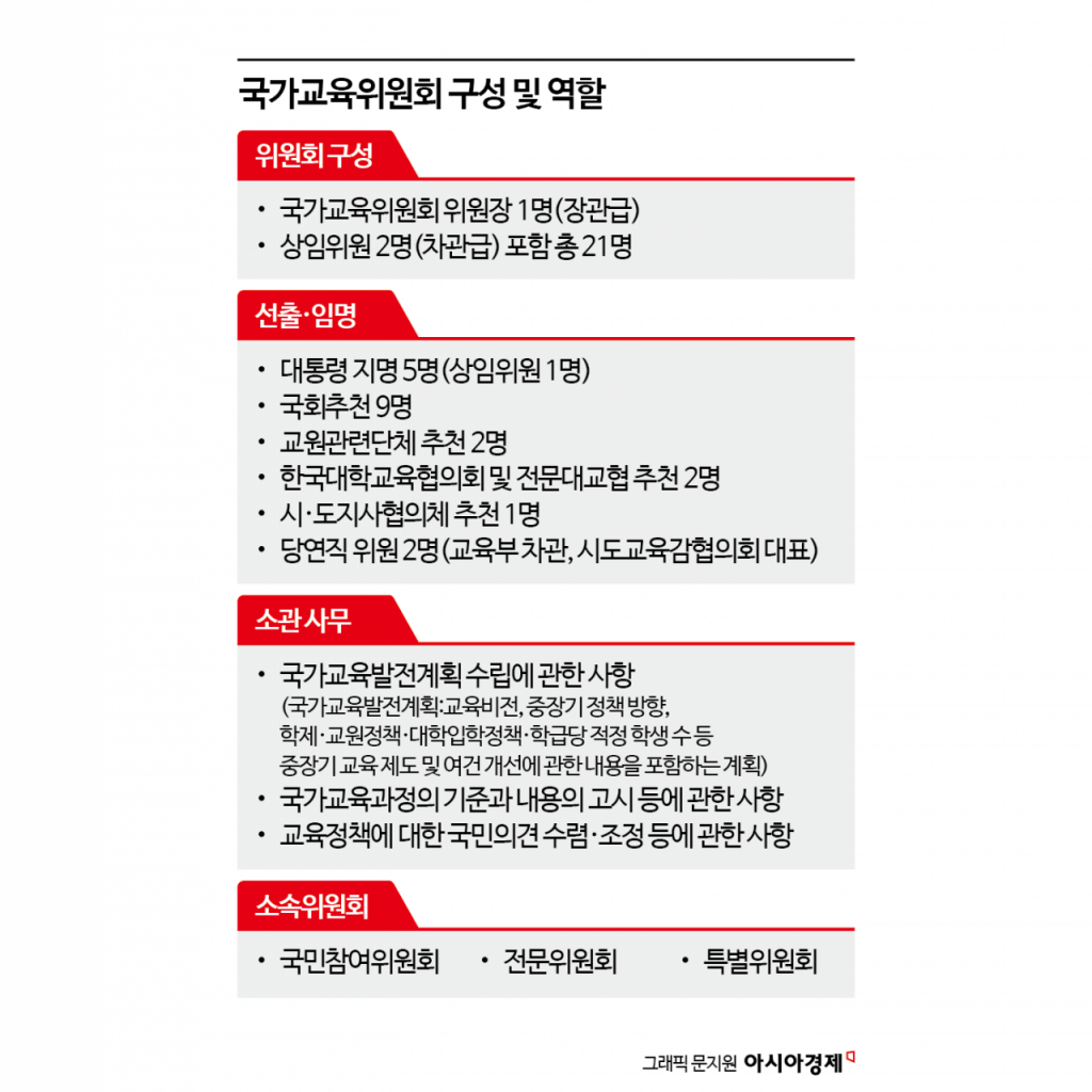 고등교육의 핵심인 대학 관련 의제는 사실상 논의조차 이뤄지지 않았다. 학령인구 감소로 지방대 붕괴, 대학원 정원 미달, 연구 경쟁력 약화 등 현안이 산적했음에도 국교위는 제 역할을 못했다. '제2기 국교위'가 닻을 올린 만큼 정권의 이념·성향을 넘어선 중립성·독립성을 확보하고, 위원들의 전문성과 역량, 정책 수립에 필요한 시간·예산 등 위원회의 모든 역량을 오로지 교육에만 쏟아부어야 한다는 지적이다.